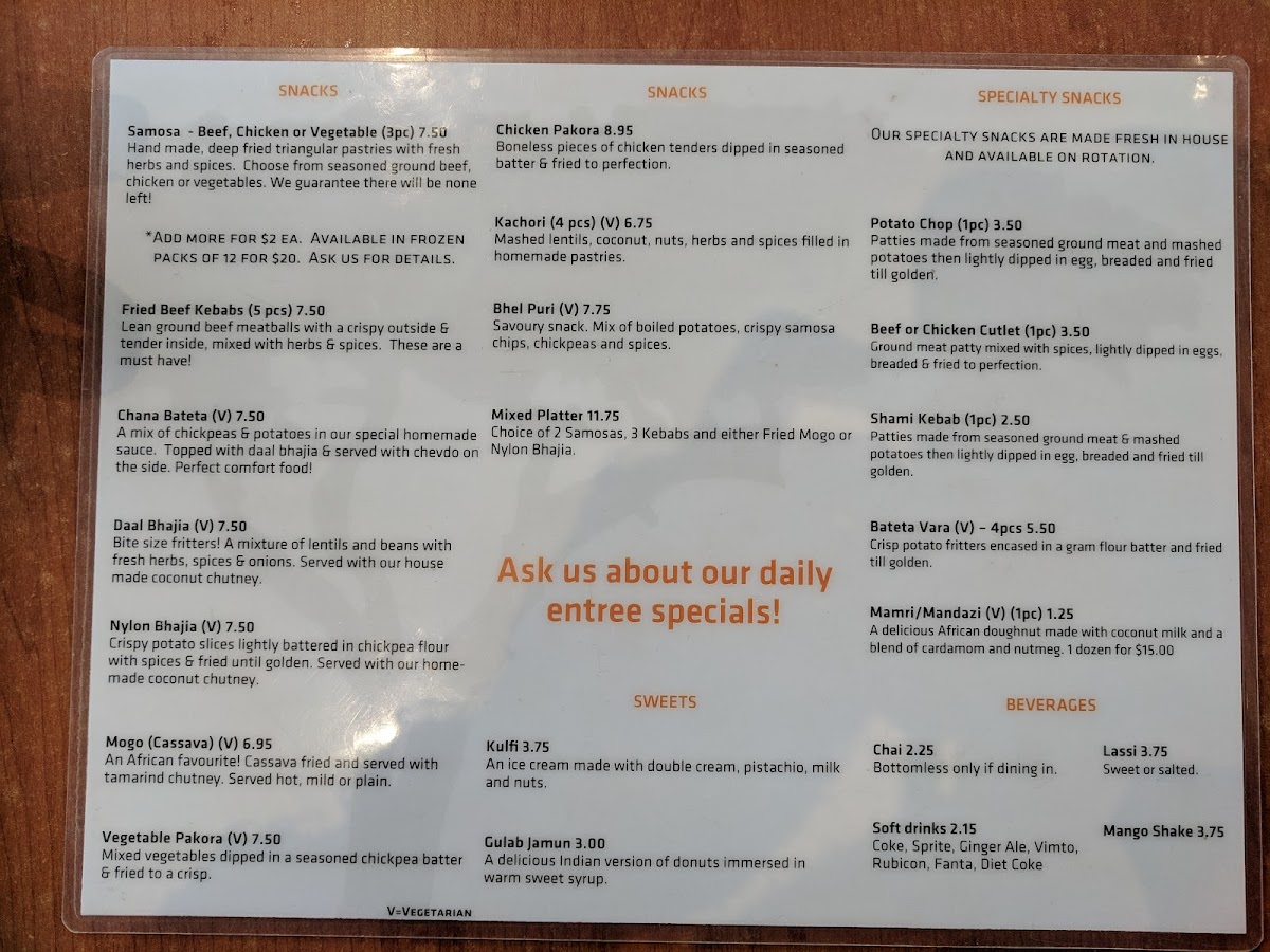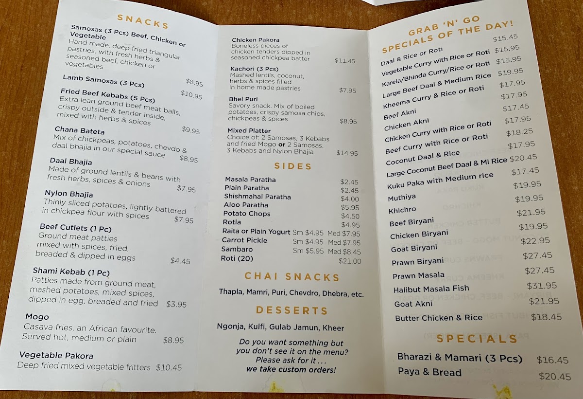 The menu features a diverse selection of East African, Indian, and Pakistani dishes, reflecting the rich culinary traditions of these regions. It is organized into several key categories to facilitate easy browsing and ordering.
