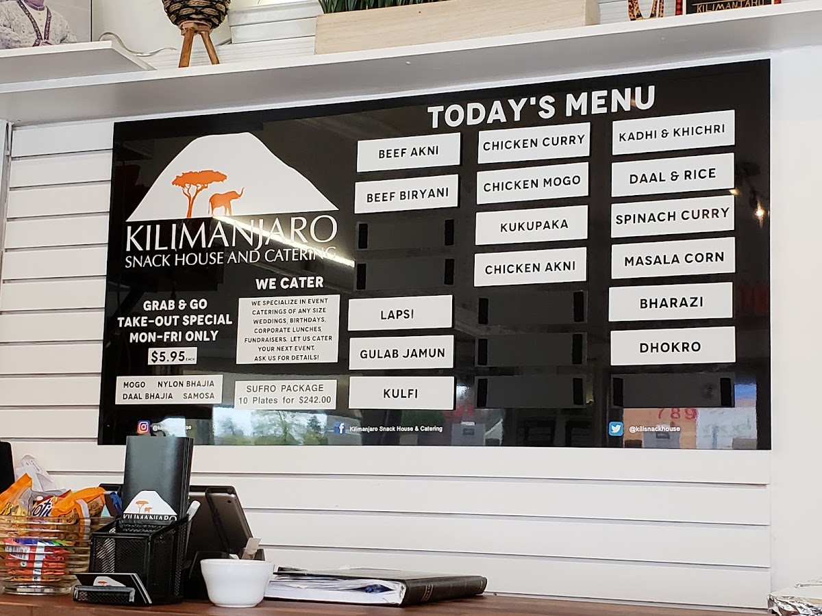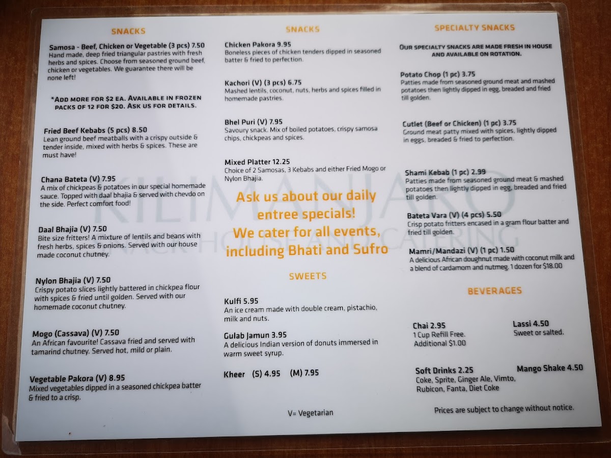 The menu is suitable for casual dining as well as catering needs, allowing visitors to choose from quick snack options or more filling meals. The variety of dishes caters to different tastes and preferences within East African, Indian, and Pakistani culinary styles.